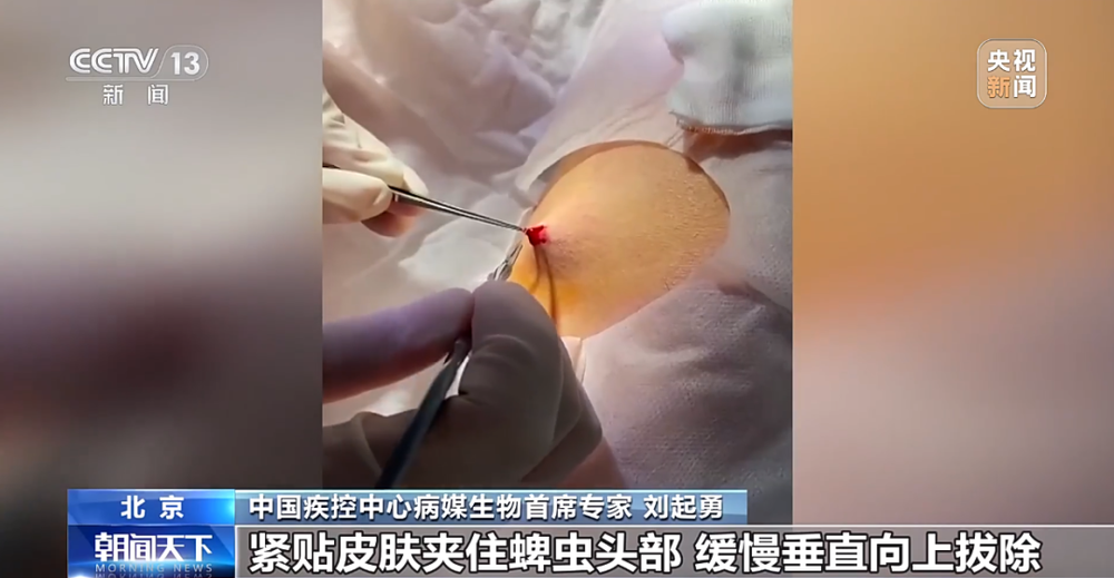 蜱虫吸血时会将头部埋入皮肤,要用镊子或专用蜱虫移除工具,紧贴皮肤夹住蜱虫头部,缓慢垂直向上拔除。